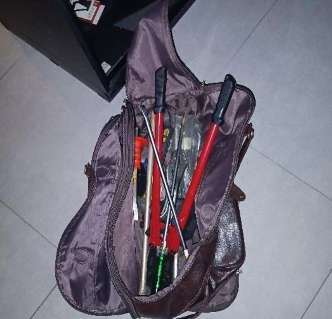 No interior da loja, os policiais localizaram diversos objetos acondicionados em um saco, prontos para serem levados. Com os autores, também foi apreendida uma bolsa de couro contendo ferramentas como chaves de fenda, alicates e marreta, utilizadas para o rompimento de obstáculos e prática do furto.