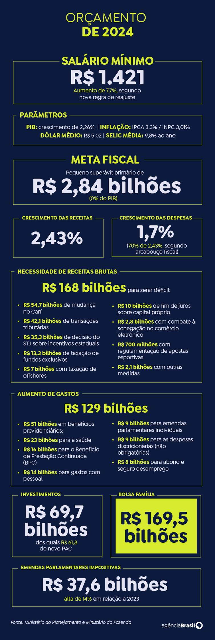 A nova regra de correção fez o governo elevar a previsão para o salário mínimo no próximo ano. O projeto da Lei Orçamentária de 2024, que será enviado até o fim da tarde desta quinta-feira (31) ao Congresso, prevê o mínimo de R$ 1.421, R$ 32 mais alto que o valor de R$ 1.389 proposto na Lei de Diretrizes Orçamentárias (LDO).