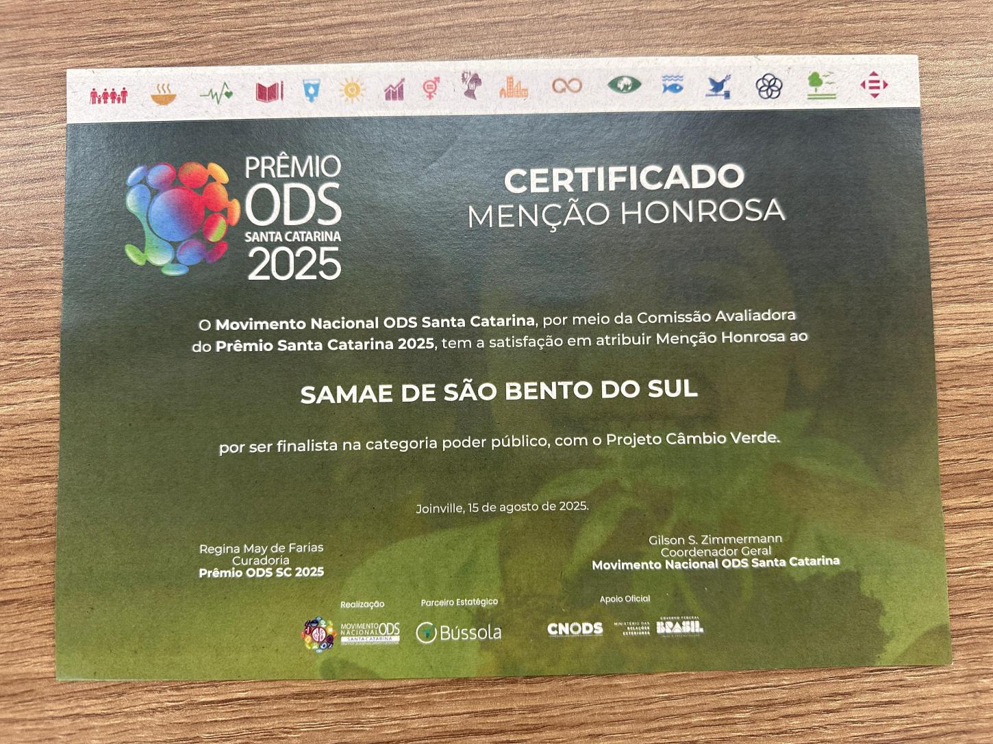 Na última sexta-feira, dia 15 de agosto, em Joinville, a Prefeitura, por meio do Samae de São Bento do Sul recebeu Menção Honrosa no Prêmio ODS Santa Catarina 2025, com o projeto “Câmbio Verde”, na categoria Poder Público. A entrega do certificado aconteceu durante o Fórum Brasil ODS, que reuniu gestores, especialistas e representantes de todo o país em prol dos Objetivos de Desenvolvimento Sustentável da ONU.